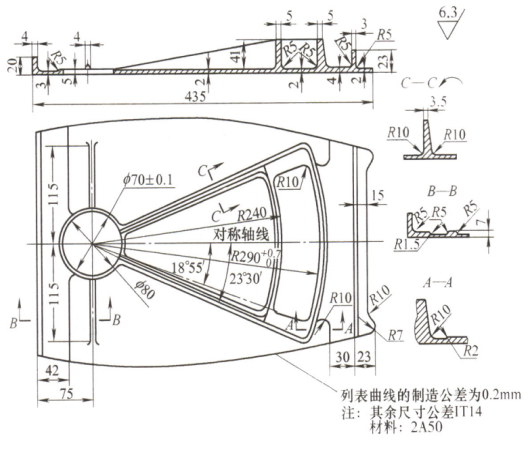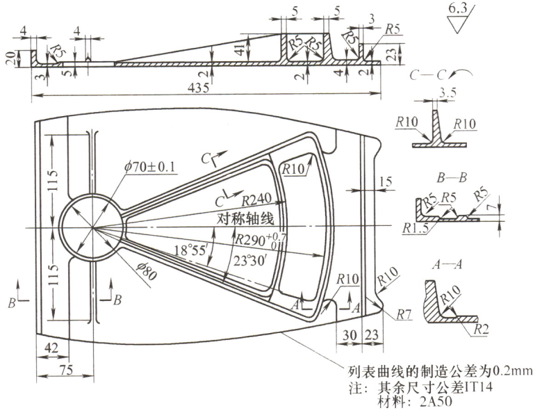 正确答案:1、工艺措施:|(1)针对零件壁薄的特点,采用专用过渡真空平台,利用真空吸紧工件,夹紧面积大,提高薄板件的装夹刚性。|(2)针对加工中易变形的特点,安排粗、精加工及钳工矫形。|(3)采用小直径铣刀加工,减小切削力。|(4)先铣加强肋,后铣腹板,最后铣外形及Φ70mm孔,有利于提高刚性,防止振动。|(5)为解决缺少定位基准的问题,在毛坯右侧对称轴线处增加一工艺凸耳,并在该凸耳上加工一工艺孔,采用“一面两孔”(底面、Φ70mm孔、工艺孔)定位。|2、工艺过程:|(1)钳工:划两侧宽度线。|(2)普通铣床:铣两侧宽度。|(3)钳工:划底面铣切线。|(4)普通铣床:铣底平面。|(5)钳工:矫平底平面、划对称轴线和定位孔。|(6)数控铣床:粗铣腹板厚度型面轮廓。|(7)钳工:矫平底面。|(8)数控铣床:精铣腹板厚度、型面轮廓及内外形。|(9)普通铣床:铣去工艺凸耳。|(10)钳工:矫平底面、表面光整、尖边倒角。