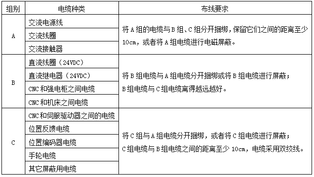正确答案:为了减小CNC信号电缆间以及与强电电缆间的相互干扰,布线时应遵循的原则是:|