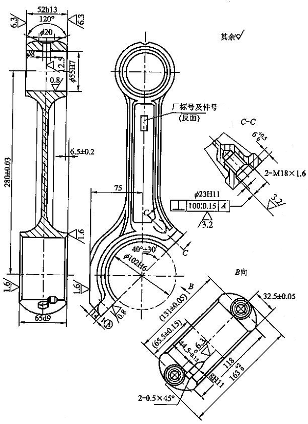 25、(主观题)连杆体零件图如下图连杆体加工工艺过程如下:工序1.模锻工序2.调质工序3.磁性探伤工序4.粗、精铣两端面工序5.磨两端面工序6.钻、扩、铰小头孔,孔口倒角工序7.粗、精铣工艺凸台及结合面工序8.连杆体两件粗镗大头孔,倒角工序9.磨结合面工序10.钻、攻螺纹孔,钻、铰定位孔工序11.精镗定位孔工序12.清洗|问题1:工序2调质起什么作用?|问题2:工序4.5.6.7如此安排的合理性。|问题3:简图画出工序7粗、精铣工艺凸台及结合面的定位方案,说明各用什么定位元件。|
