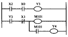 正确答案:0 LD X2|1 AND X0|2 OUT Y3|3 LD Y3|4 ANI X3|5 OUT M101|6 AND M101|7 OUT Y4