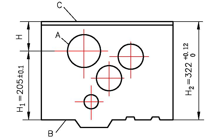 14、(多选题)如图所示,镗孔A时中心高设计尺寸为H1,若加工中为方便定位装夹,以C面为定位基准镗孔,这时孔的高度尺寸为H,则图中H1、H2、H形成的尺寸链中,()。